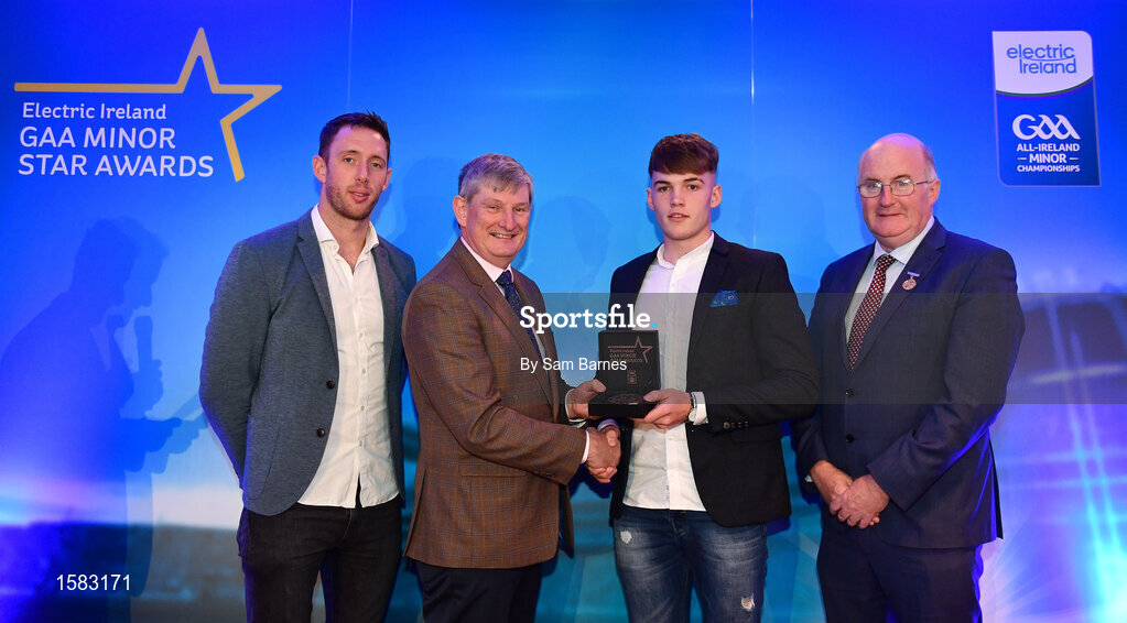 29 September 2018; Conor Whelan of CJ Kickhams, Tipperary, is presented with his Hurling Team of the Year Award by Pat O’Doherty, ESB Chief Executive, alongside Former Kilkenny hurler and Electric Ireland Minor Star Awards judge Michael Fennelly, left, and Uachtarán Chumann Lúthcleas Gael John Horan. The Hurling and Football Team of the Year was selected by an expert panel of GAA legends including Ollie Canning, Sean Cavanagh, Michael Fennelly and Daniel Goulding. Sponsors of the GAA Minor Championships, Electric Ireland today recognised the talent and dedication of 15 Minor football players, and 15 Minor hurling players at the second annual Electric Ireland Minor Star Awards at Croke Park. #GAAThisIsMajor Photo by Sam Barnes/Sportsfile