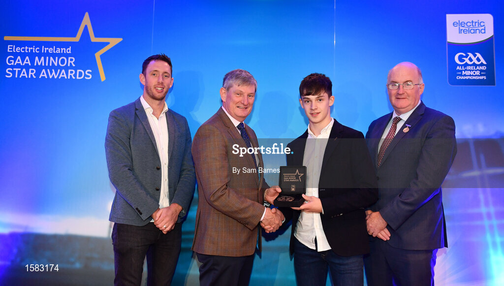 29 September 2018; Seán Phelan of Nenagh Eire OG, Tipperary, is presented with his Hurling Team of the Year Award by Pat O’Doherty, ESB Chief Executive, alongside Former Kilkenny hurler and Electric Ireland Minor Star Awards judge Michael Fennelly, left, and Uachtarán Chumann Lúthcleas Gael John Horan. The Hurling and Football Team of the Year was selected by an expert panel of GAA legends including Ollie Canning, Sean Cavanagh, Michael Fennelly and Daniel Goulding. Sponsors of the GAA Minor Championships, Electric Ireland today recognised the talent and dedication of 15 Minor football players, and 15 Minor hurling players at the second annual Electric Ireland Minor Star Awards at Croke Park. #GAAThisIsMajor Photo by Sam Barnes/Sportsfile