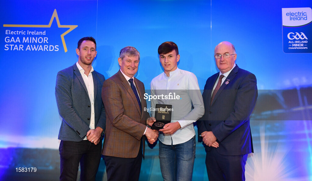29 September 2018; Cathal O’Neill of Crecora-Manister, Limerick, is presented with his Hurling Team of the Year Award by Pat O’Doherty, ESB Chief Executive, alongside Former Kilkenny hurler and Electric Ireland Minor Star Awards judge Michael Fennelly, left, and Uachtarán Chumann Lúthcleas Gael John Horan. The Hurling and Football Team of the Year was selected by an expert panel of GAA legends including Ollie Canning, Sean Cavanagh, Michael Fennelly and Daniel Goulding. Sponsors of the GAA Minor Championships, Electric Ireland today recognised the talent and dedication of 15 Minor football players, and 15 Minor hurling players at the second annual Electric Ireland Minor Star Awards at Croke Park. #GAAThisIsMajor Photo by Sam Barnes/Sportsfile