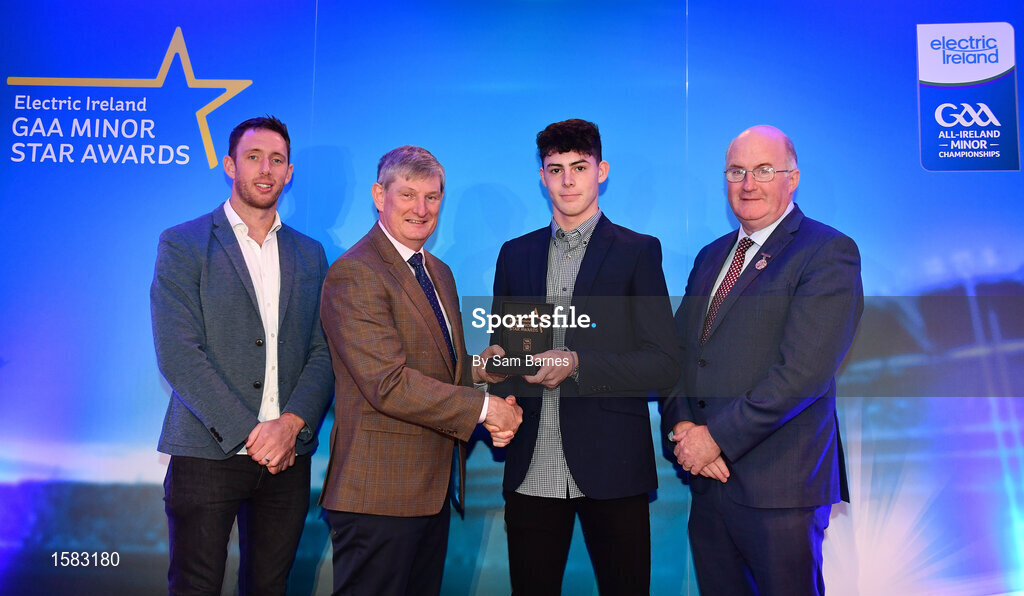 29 September 2018; Donal Leavy of Naomh Olaf, Dublin, is presented with his Hurling Team of the Year Award by Pat O’Doherty, ESB Chief Executive, alongside Former Kilkenny hurler and Electric Ireland Minor Star Awards judge Michael Fennelly, left, and Uachtarán Chumann Lúthcleas Gael John Horan. The Hurling and Football Team of the Year was selected by an expert panel of GAA legends including Ollie Canning, Sean Cavanagh, Michael Fennelly and Daniel Goulding. Sponsors of the GAA Minor Championships, Electric Ireland today recognised the talent and dedication of 15 Minor football players, and 15 Minor hurling players at the second annual Electric Ireland Minor Star Awards at Croke Park. #GAAThisIsMajor Photo by Sam Barnes/Sportsfile