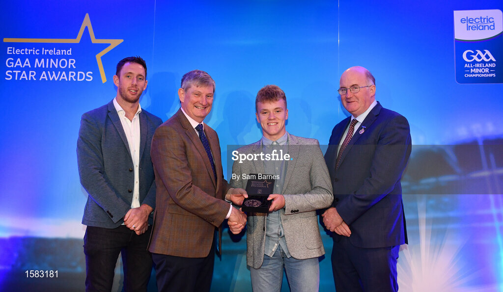 29 September 2018; James Devaney of Borris-Ileigh, Tipperary, is presented with his Hurling Team of the Year Award by Pat O’Doherty, ESB Chief Executive, alongside Former Kilkenny hurler and Electric Ireland Minor Star Awards judge Michael Fennelly, left, and Uachtarán Chumann Lúthcleas Gael John Horan. The Hurling and Football Team of the Year was selected by an expert panel of GAA legends including Ollie Canning, Sean Cavanagh, Michael Fennelly and Daniel Goulding. Sponsors of the GAA Minor Championships, Electric Ireland today recognised the talent and dedication of 15 Minor football players, and 15 Minor hurling players at the second annual Electric Ireland Minor Star Awards at Croke Park. #GAAThisIsMajor Photo by Sam Barnes/Sportsfile