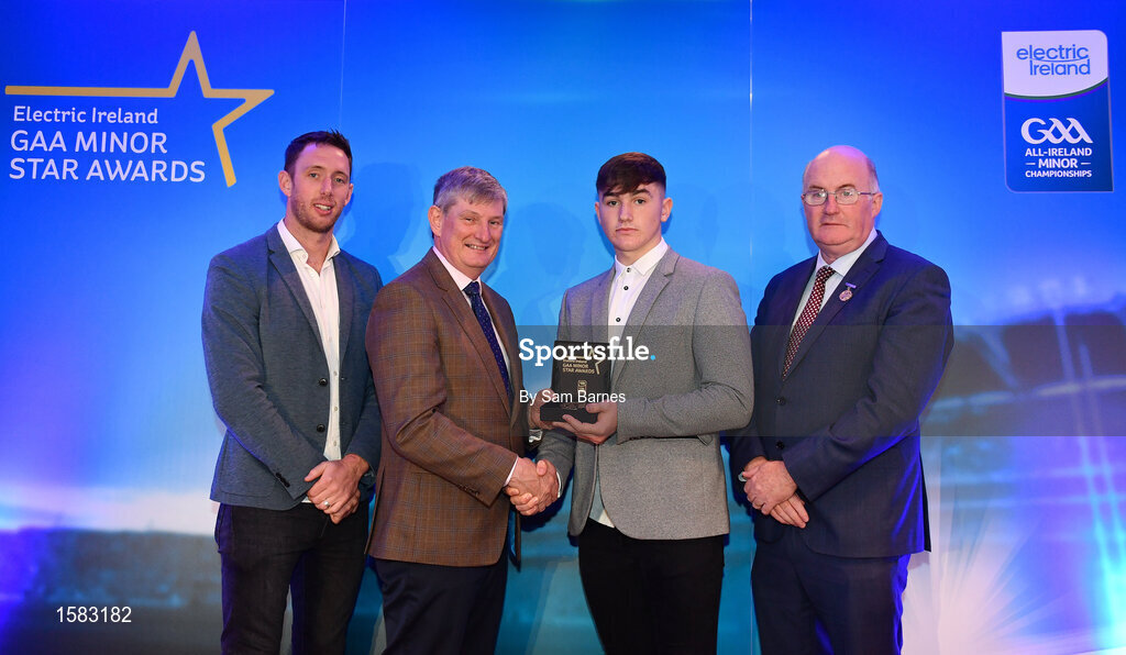 29 September 2018; Luke Swan of Castleknock, Dublin, is presented with his Hurling Team of the Year Award by Pat O’Doherty, ESB Chief Executive, alongside Former Kilkenny hurler and Electric Ireland Minor Star Awards judge Michael Fennelly, left, and Uachtarán Chumann Lúthcleas Gael John Horan. The Hurling and Football Team of the Year was selected by an expert panel of GAA legends including Ollie Canning, Sean Cavanagh, Michael Fennelly and Daniel Goulding. Sponsors of the GAA Minor Championships, Electric Ireland today recognised the talent and dedication of 15 Minor football players, and 15 Minor hurling players at the second annual Electric Ireland Minor Star Awards at Croke Park. #GAAThisIsMajor Photo by Sam Barnes/Sportsfile