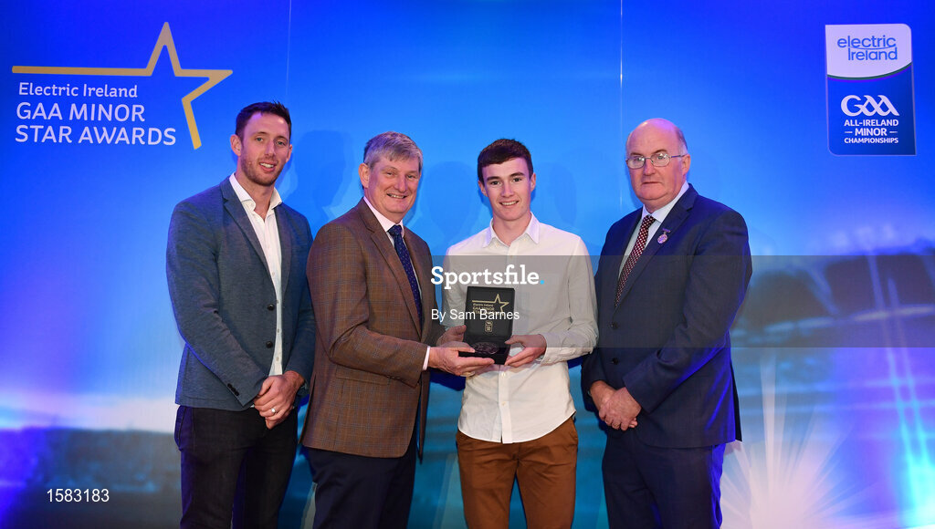 29 September 2018; Donal O’Shea of Salthill/Knocknacarra, Galway, is presented with his Hurling Team of the Year Award by Pat O’Doherty, ESB Chief Executive, alongside Former Kilkenny hurler and Electric Ireland Minor Star Awards judge Michael Fennelly, left, and Uachtarán Chumann Lúthcleas Gael John Horan. The Hurling and Football Team of the Year was selected by an expert panel of GAA legends including Ollie Canning, Sean Cavanagh, Michael Fennelly and Daniel Goulding. Sponsors of the GAA Minor Championships, Electric Ireland today recognised the talent and dedication of 15 Minor football players, and 15 Minor hurling players at the second annual Electric Ireland Minor Star Awards at Croke Park. #GAAThisIsMajor Photo by Sam Barnes/Sportsfile