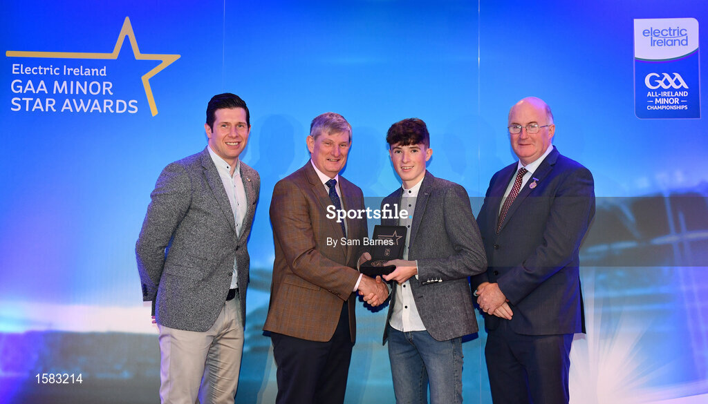 29 September 2018; Aaron Mulligan of Latton, Monaghan, is presented with his Football Team of the Year Award by Pat O’Doherty, ESB Chief Executive, alongside Former Tyrone footballer and Electric Ireland Minor Star Awards judge Sean Cavanagh, left, and Uachtarán Chumann Lúthcleas Gael John Horan. The Hurling and Football Team of the Year was selected by an expert panel of GAA legends including Ollie Canning, Sean Cavanagh, Michael Fennelly and Daniel Goulding. Sponsors of the GAA Minor Championships, Electric Ireland today recognised the talent and dedication of 15 Minor football players, and 15 Minor hurling players at the second annual Electric Ireland Minor Star Awards at Croke Park. #GAAThisIsMajor Photo by Sam Barnes/Sportsfile