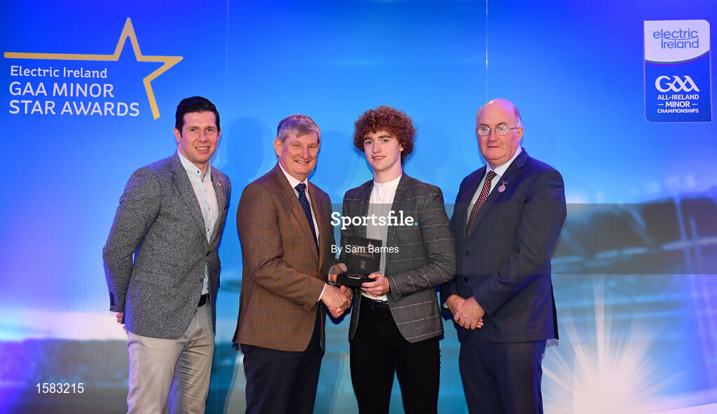 29 September 2018; Paul Walsh of Brosna, Kerry, is presented with his Football Team of the Year Award by Pat O’Doherty, ESB Chief Executive, alongside Former Tyrone footballer and Electric Ireland Minor Star Awards judge Sean Cavanagh, left, and Uachtarán Chumann Lúthcleas Gael John Horan. The Hurling and Football Team of the Year was selected by an expert panel of GAA legends including Ollie Canning, Sean Cavanagh, Michael Fennelly and Daniel Goulding. Sponsors of the GAA Minor Championships, Electric Ireland today recognised the talent and dedication of 15 Minor football players, and 15 Minor hurling players at the second annual Electric Ireland Minor Star Awards at Croke Park. #GAAThisIsMajor Photo by Sam Barnes/Sportsfile