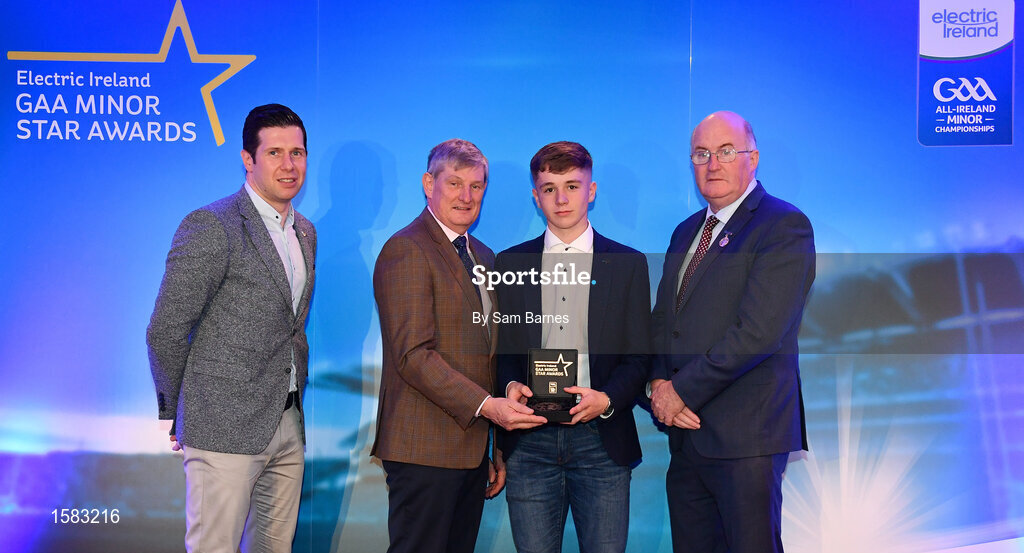 29 September 2018; Mark Lavin of Lucan Sarsfields, Dublin, is presented with his Football Team of the Year Award by Pat O’Doherty, ESB Chief Executive, alongside Former Tyrone footballer and Electric Ireland Minor Star Awards judge Sean Cavanagh, left, and Uachtarán Chumann Lúthcleas Gael John Horan. The Hurling and Football Team of the Year was selected by an expert panel of GAA legends including Ollie Canning, Sean Cavanagh, Michael Fennelly and Daniel Goulding. Sponsors of the GAA Minor Championships, Electric Ireland today recognised the talent and dedication of 15 Minor football players, and 15 Minor hurling players at the second annual Electric Ireland Minor Star Awards at Croke Park. #GAAThisIsMajor Photo by Sam Barnes/Sportsfile