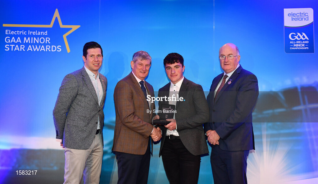29 September 2018; Darragh Rahilly of Rathmore, Kerry, is presented with his Football Team of the Year Award by Pat O’Doherty, ESB Chief Executive, alongside Former Tyrone footballer and Electric Ireland Minor Star Awards judge Sean Cavanagh, left, and Uachtarán Chumann Lúthcleas Gael John Horan. The Hurling and Football Team of the Year was selected by an expert panel of GAA legends including Ollie Canning, Sean Cavanagh, Michael Fennelly and Daniel Goulding. Sponsors of the GAA Minor Championships, Electric Ireland today recognised the talent and dedication of 15 Minor football players, and 15 Minor hurling players at the second annual Electric Ireland Minor Star Awards at Croke Park. #GAAThisIsMajor Photo by Sam Barnes/Sportsfile