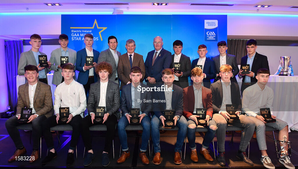 29 September 2018; Pat O’Doherty, ESB Chief Executive, backrow centre, Uachtarán Chumann Lúthcleas Gael John Horan, right, and Former Tyrone footballer and Electric Ireland Minor Star Awards judge Sean Cavanagh, left, with the The Electric Ireland Minor Football Team of the Year at the 2018 Electric Ireland Minor Star Awards. The Football Team of the Year was selected by an expert panel of GAA legends including Ollie Canning, Sean Cavanagh, Michael Fennelly and Daniel Goulding. Sponsors of the GAA Minor Championships, Electric Ireland today recognised the talent and dedication of 15 Minor football players, and 15 Minor hurling players at the second annual Electric Ireland Minor Star Awards at Croke Park. #GAAThisIsMajor Photo by Sam Barnes/Sportsfile