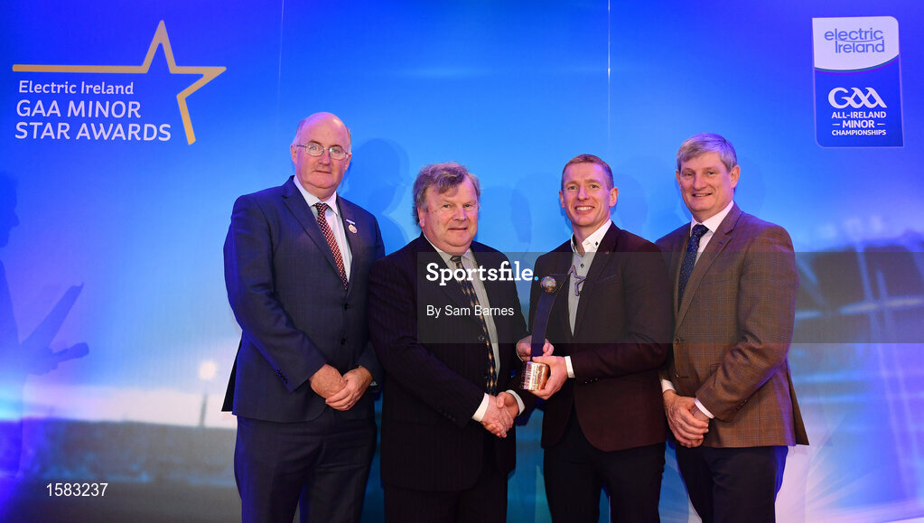 29 September 2018; Electric Ireland Special Merit Award Winner, Mattie Murphy, second from left, is presented with his award by Former Galway hurler and Electric Ireland Minor Star Awards judge Ollie Canning, alongside, Uachtarán Chumann Lúthcleas Gael John Horan, left, and Pat O’Doherty, ESB Chief Executive, at the 2018 Electric Ireland Minor Star Awards. The Football Team of the Year was selected by an expert panel of GAA legends including Ollie Canning, Sean Cavanagh, Michael Fennelly and Daniel Goulding. Sponsors of the GAA Minor Championships, Electric Ireland today recognised the talent and dedication of 15 Minor football players, and 15 Minor hurling players at the second annual Electric Ireland Minor Star Awards at Croke Park. #GAAThisIsMajor Photo by Sam Barnes/Sportsfile