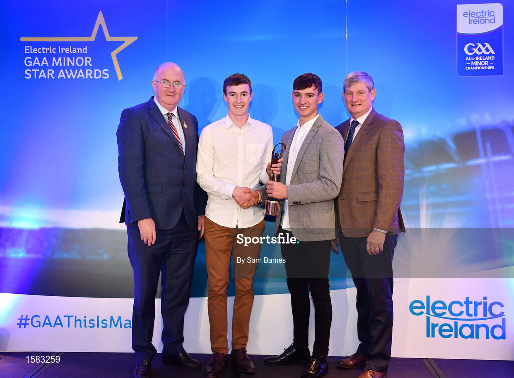 29 September 2018; Electric Ireland Minor Hurler of the Year 2018 Donal O’Shea of Salthill/Knocknacarra, Galway, second from left, is presented with his award by last years winner Brian Turnbull of Cork, alongside Uachtarán Chumann Lúthcleas Gael John Horan, left, and Pat O’Doherty, ESB Chief Executive, at the 2018 Electric Ireland Minor Star Awards. The Football Team of the Year was selected by an expert panel of GAA legends including Ollie Canning, Sean Cavanagh, Michael Fennelly and Daniel Goulding. Sponsors of the GAA Minor Championships, Electric Ireland today recognised the talent and dedication of 15 Minor football players, and 15 Minor hurling players at the second annual Electric Ireland Minor Star Awards at Croke Park. #GAAThisIsMajor Photo by Sam Barnes/Sportsfile