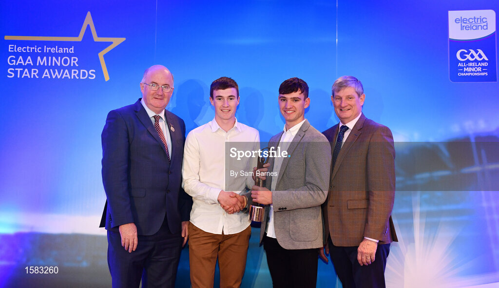 29 September 2018; Electric Ireland Minor Hurler of the Year 2018 Donal O’Shea of Salthill/Knocknacarra, Galway, second from left, is presented with his award by last years winner Brian Turnbull of Cork, alongside Uachtarán Chumann Lúthcleas Gael John Horan, left, and Pat O’Doherty, ESB Chief Executive, at the 2018 Electric Ireland Minor Star Awards. The Football Team of the Year was selected by an expert panel of GAA legends including Ollie Canning, Sean Cavanagh, Michael Fennelly and Daniel Goulding. Sponsors of the GAA Minor Championships, Electric Ireland today recognised the talent and dedication of 15 Minor football players, and 15 Minor hurling players at the second annual Electric Ireland Minor Star Awards at Croke Park. #GAAThisIsMajor Photo by Sam Barnes/Sportsfile