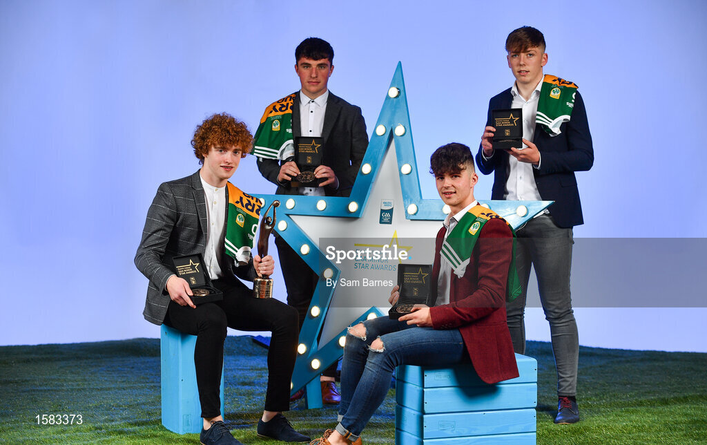 29 September 2018; Electric Ireland Minor Footballer of the Year 2018, Paul Walsh of Brosna, Kerry, left, Darragh Rahilly of Rathmore, Kerry, Owen Fitzgerald of Gneeveguilla, Kerry, and Colm Moriarty of Annascaul, Kerry, with their Minor Football Team of the Year Awards at the 2018 Electric Ireland Minor Star Awards. The Hurling and Football Team of the Year was selected by an expert panel of GAA legends including Ollie Canning, Sean Cavanagh, Michael Fennelly and Daniel Goulding. Sponsors of the GAA Minor Championships, Electric Ireland today recognised the talent and dedication of 15 Minor football players, and 15 Minor hurling players at the second annual Electric Ireland Minor Star Awards at Croke Park. #GAAThisIsMajor Photo by Sam Barnes/Sportsfile