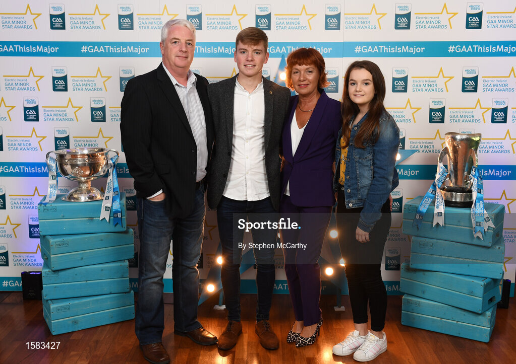29 September 2018; Ciarán Brennan of Bennettsbridge, Kilkenny, with family, from left, Paul, Clare and Luci on their arrival at the 2018 Electric Ireland Minor Star Awards. The Hurling/Football Team of the Year was selected by an expert panel of GAA legends including Ollie Canning, Sean Cavanagh, Michael Fennelly and Daniel Goulding. Sponsors of the GAA Minor Championships, Electric Ireland today recognised the talent and dedication of 15 Minor football players, and 15 Minor hurling players at the second annual Electric Ireland Minor Star Awards at Croke Park. #GAAThisIsMajor Photo by Stephen McCarthy/Sportsfile