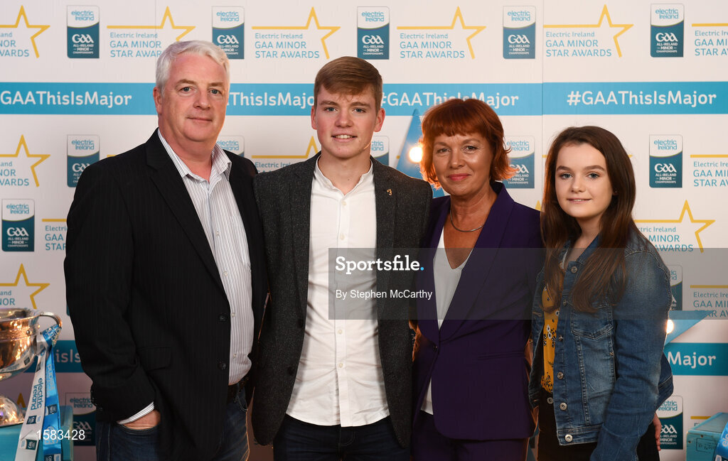 29 September 2018; Ciarán Brennan of Bennettsbridge, Kilkenny, with family, from left, Paul, Clare and Luci on their arrival at the 2018 Electric Ireland Minor Star Awards. The Hurling/Football Team of the Year was selected by an expert panel of GAA legends including Ollie Canning, Sean Cavanagh, Michael Fennelly and Daniel Goulding. Sponsors of the GAA Minor Championships, Electric Ireland today recognised the talent and dedication of 15 Minor football players, and 15 Minor hurling players at the second annual Electric Ireland Minor Star Awards at Croke Park. #GAAThisIsMajor Photo by Stephen McCarthy/Sportsfile