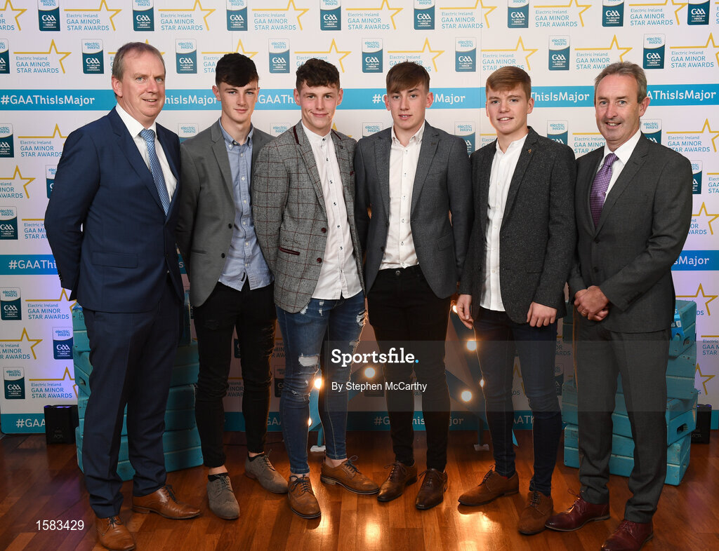 29 September 2018; Kilkenny hurlers, from left, Conor Kelly of O’Loughlin Gaels, Jamie Young of O’Loughlin Gaels, Darragh Maher of St. Lachtain’s, and Ciarán Brennan of Bennettsbridge, with Adrian Finan, left, and Richie Mulrooney, right, on their arrival at the 2018 Electric Ireland Minor Star Awards. The Hurling/Football Team of the Year was selected by an expert panel of GAA legends including Ollie Canning, Sean Cavanagh, Michael Fennelly and Daniel Goulding. Sponsors of the GAA Minor Championships, Electric Ireland today recognised the talent and dedication of 15 Minor football players, and 15 Minor hurling players at the second annual Electric Ireland Minor Star Awards at Croke Park. #GAAThisIsMajor Photo by Stephen McCarthy/Sportsfile