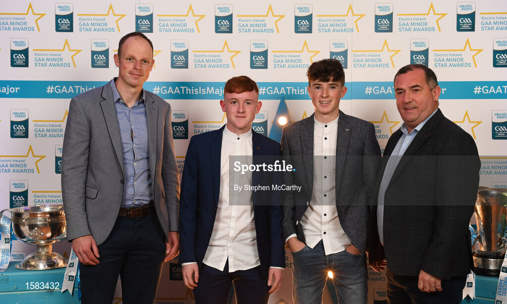 29 September 2018; Monaghan minor footballers Ronan Grimes of Killanny, second from left, and Aaron Mulligan of Latton, with David McCague, left, and manager Seamus McEnaney, right, on their arrival at the 2018 Electric Ireland Minor Star Awards. The Hurling/Football Team of the Year was selected by an expert panel of GAA legends including Ollie Canning, Sean Cavanagh, Michael Fennelly and Daniel Goulding. Sponsors of the GAA Minor Championships, Electric Ireland today recognised the talent and dedication of 15 Minor football players, and 15 Minor hurling players at the second annual Electric Ireland Minor Star Awards at Croke Park. #GAAThisIsMajor Photo by Stephen McCarthy/Sportsfile