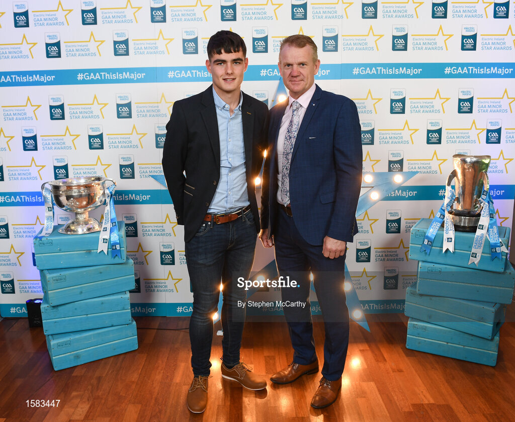 29 September 2018; Eoin Darcy of Tinahely, Wicklow, and manager Kevin O'Brien on their arrival at the 2018 Electric Ireland Minor Star Awards. The Hurling/Football Team of the Year was selected by an expert panel of GAA legends including Ollie Canning, Sean Cavanagh, Michael Fennelly and Daniel Goulding. Sponsors of the GAA Minor Championships, Electric Ireland today recognised the talent and dedication of 15 Minor football players, and 15 Minor hurling players at the second annual Electric Ireland Minor Star Awards at Croke Park. #GAAThisIsMajor Photo by Stephen McCarthy/Sportsfile