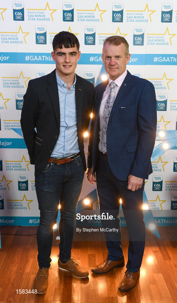 29 September 2018; Eoin Darcy of Tinahely, Wicklow, and manager Kevin O'Brien on their arrival at the 2018 Electric Ireland Minor Star Awards. The Hurling/Football Team of the Year was selected by an expert panel of GAA legends including Ollie Canning, Sean Cavanagh, Michael Fennelly and Daniel Goulding. Sponsors of the GAA Minor Championships, Electric Ireland today recognised the talent and dedication of 15 Minor football players, and 15 Minor hurling players at the second annual Electric Ireland Minor Star Awards at Croke Park. #GAAThisIsMajor Photo by Stephen McCarthy/Sportsfile