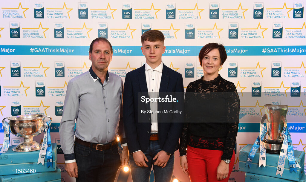 29 September 2018; Mark Lavin of Lucan Sarsfields, Dublin, with parents Joe and Anne Marie on their arrival at the 2018 Electric Ireland Minor Star Awards. The Hurling/Football Team of the Year was selected by an expert panel of GAA legends including Ollie Canning, Sean Cavanagh, Michael Fennelly and Daniel Goulding. Sponsors of the GAA Minor Championships, Electric Ireland today recognised the talent and dedication of 15 Minor football players, and 15 Minor hurling players at the second annual Electric Ireland Minor Star Awards at Croke Park. #GAAThisIsMajor Photo by Stephen McCarthy/Sportsfile