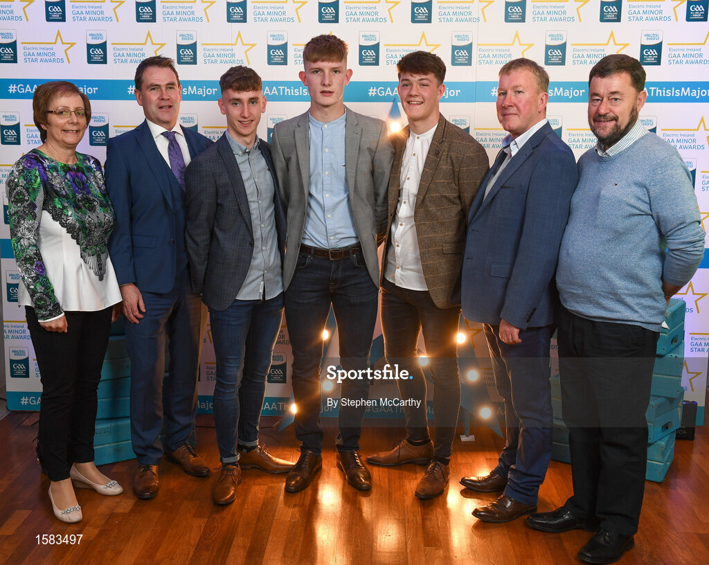29 September 2018; Galway footballers, from left, Matthew Cooley of Corofin, Conor Raftery of Northern Gaels, and Tony Gill of Corofin, with Mary Judge, Cosmas Gilmore, Michéal Geraghty and Seamus O'Grady on their arrival at the 2018 Electric Ireland Minor Star Awards. The Hurling/Football Team of the Year was selected by an expert panel of GAA legends including Ollie Canning, Sean Cavanagh, Michael Fennelly and Daniel Goulding. Sponsors of the GAA Minor Championships, Electric Ireland today recognised the talent and dedication of 15 Minor football players, and 15 Minor hurling players at the second annual Electric Ireland Minor Star Awards at Croke Park. #GAAThisIsMajor Photo by Stephen McCarthy/Sportsfile