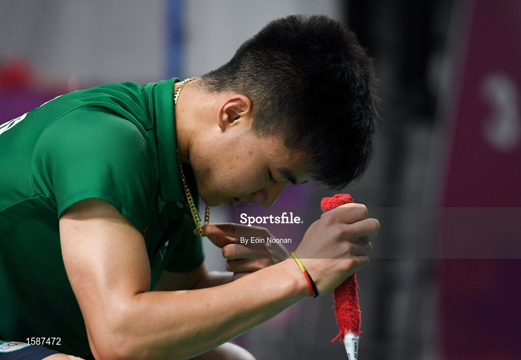 10 October 2018; Nhat Nguyen of Team Ireland, from Clarehall, Dublin, reacts after defeat to Shifeng Li of China during the men's badminton singles, quarter final round, in Tecnópolis park, Buenos Aires, on Day 4 of the Youth Olympic Games in Buenos Aires, Argentina. Photo by Eóin Noonan/Sportsfile