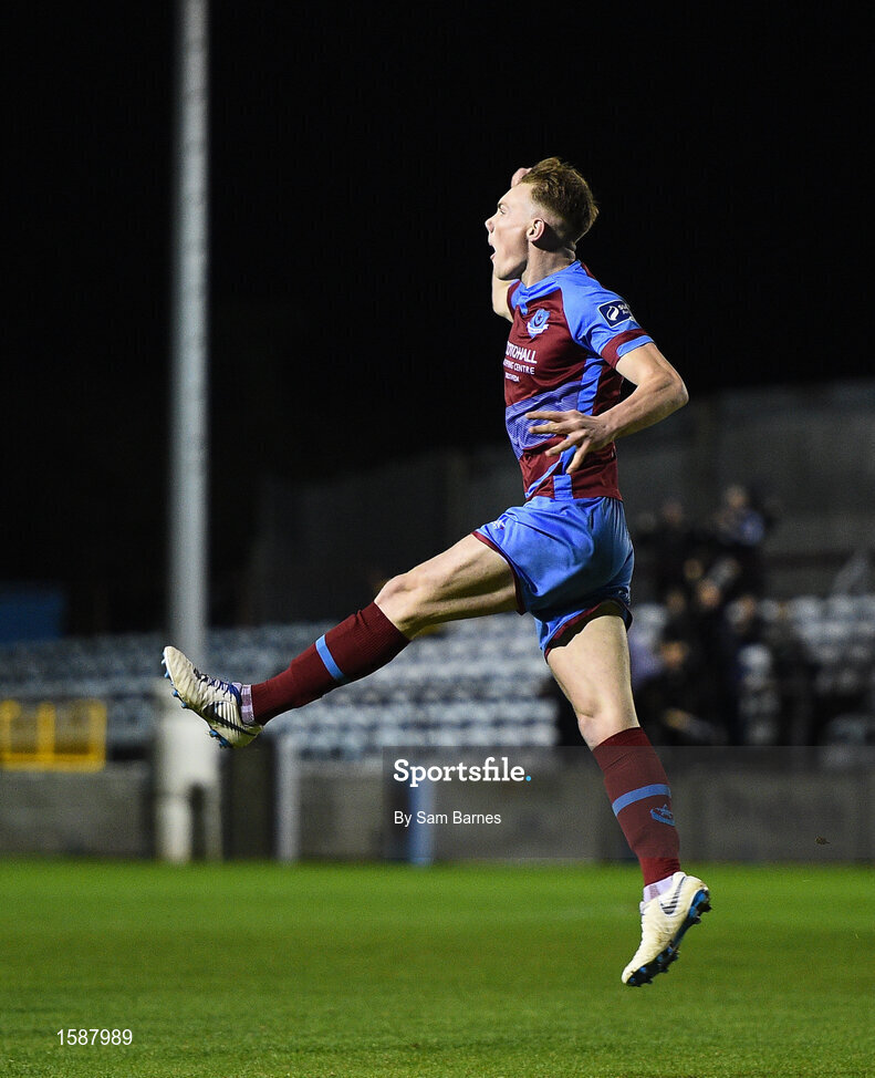12 October 2018; Ciaran Kelly of Drogheda United celebrates after scoring his side's first goal during the SSE Airtricity League Promotion / Relegation Play-off Series 1st leg match between Drogheda United and Finn Harps at United Park in Louth. Photo by Sam Barnes/Sportsfile