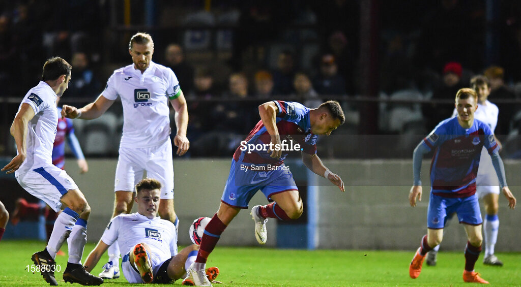 12 October 2018; Chris Lyons of Drogheda United is tackled by Niall Logue of Finn Harps during the SSE Airtricity League Promotion / Relegation Play-off Series 1st leg match between Drogheda United and Finn Harps at United Park in Louth. Photo by Sam Barnes/Sportsfile