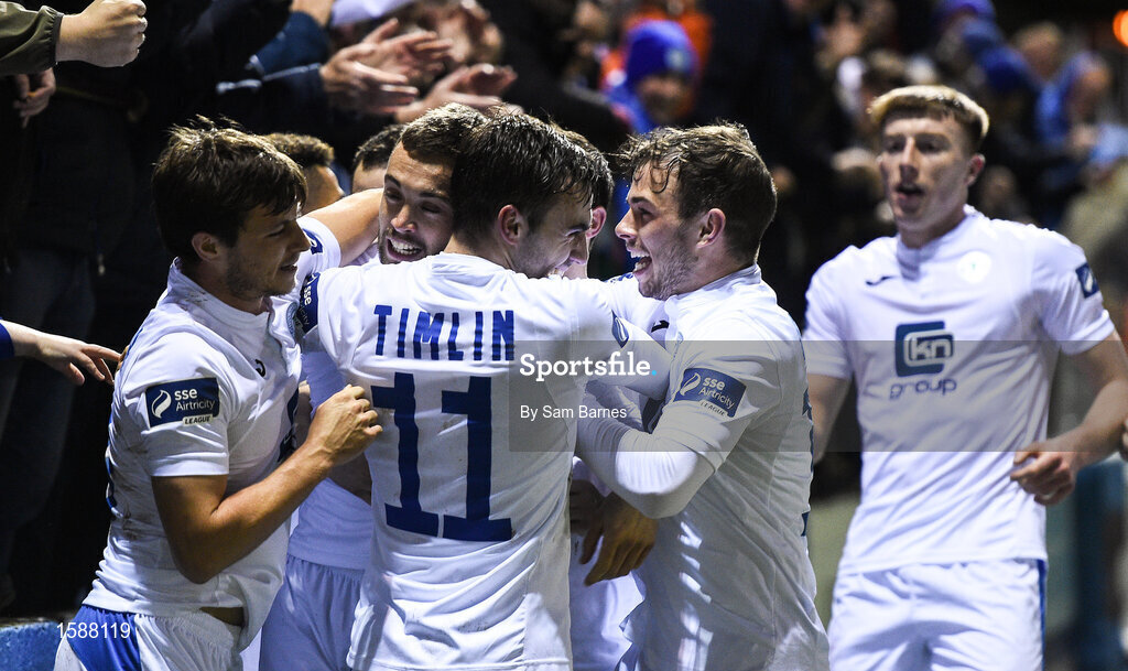 12 October 2018; Nathan Boyle of Finn Harps, second from left, celebrates with teammates after scoring his sides first goal during the SSE Airtricity League Promotion / Relegation Play-off Series 1st leg match between Drogheda United and Finn Harps at United Park in Louth. Photo by Sam Barnes/Sportsfile