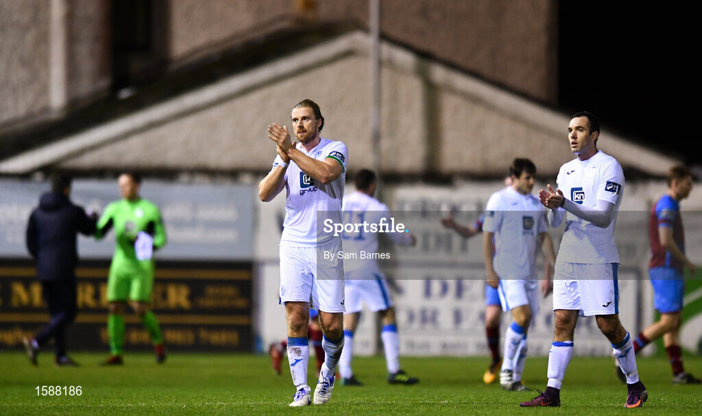 12 October 2018; Keith Cowen of Finn Harps, centre, thanks the travelling supporters following the SSE Airtricity League Promotion / Relegation Play-off Series 1st leg match between Drogheda United and Finn Harps at United Park in Louth. Photo by Sam Barnes/Sportsfile