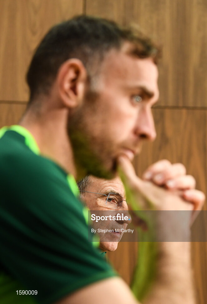 15 October 2018; Republic of Ireland manager Martin O'Neill and Richard Keogh during a press conference at the FAI National Training Centre in Abbotstown, Dublin. Photo by Stephen McCarthy/Sportsfile