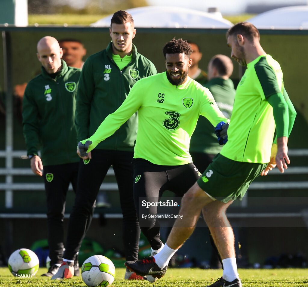 15 October 2018; Cyrus Christie, centre, during a Republic of Ireland training session at the FAI National Training Centre in Abbotstown, Dublin. Photo by Stephen McCarthy/Sportsfile