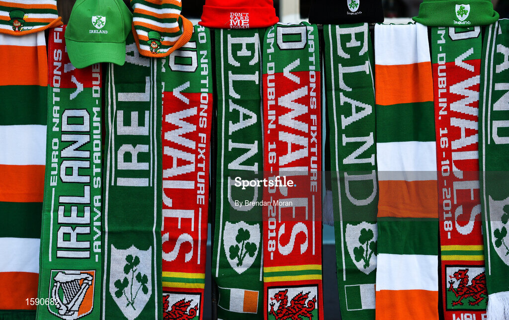16 October 2018; Wales and Republic of Ireland merchandise on sale outside of the Aviva Stadium prior to the UEFA Nations League B group four match between Republic of Ireland and Wales at the Aviva Stadium in Dublin. Photo by Brendan Moran/Sportsfile