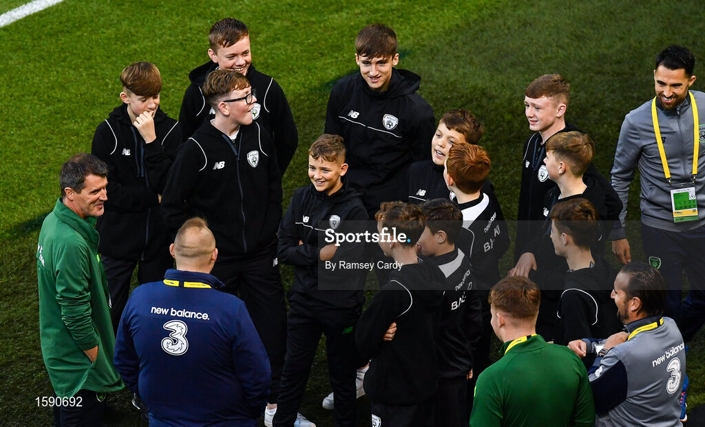 16 October 2018; Republic of Ireland assistant manager Roy Keane with ballkids ahead of the UEFA Nations League B group four match between Republic of Ireland and Wales at the Aviva Stadium in Dublin. Photo by Ramsey Cardy/Sportsfile