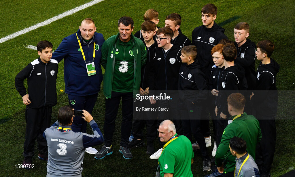 16 October 2018; Republic of Ireland assistant manager Roy Keane with ballkids ahead of the UEFA Nations League B group four match between Republic of Ireland and Wales at the Aviva Stadium in Dublin. Photo by Ramsey Cardy/Sportsfile