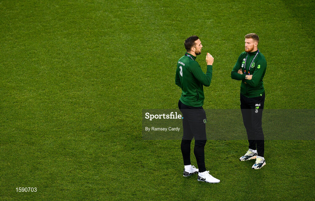 16 October 2018; Shane Duffy, left, and James McClean of Republic of Ireland ahead of the UEFA Nations League B group four match between Republic of Ireland and Wales at the Aviva Stadium in Dublin. Photo by Ramsey Cardy/Sportsfile