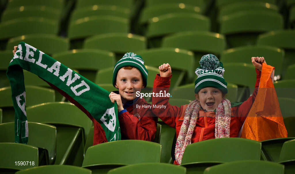 16 October 2018; Republic of Ireland supporters Rian, age 11, and Libby Reilly, age 8, from Leixlip, County Kildare, prior to the UEFA Nations League B group four match between Republic of Ireland and Wales at the Aviva Stadium in Dublin. Photo by Harry Murphy/Sportsfile