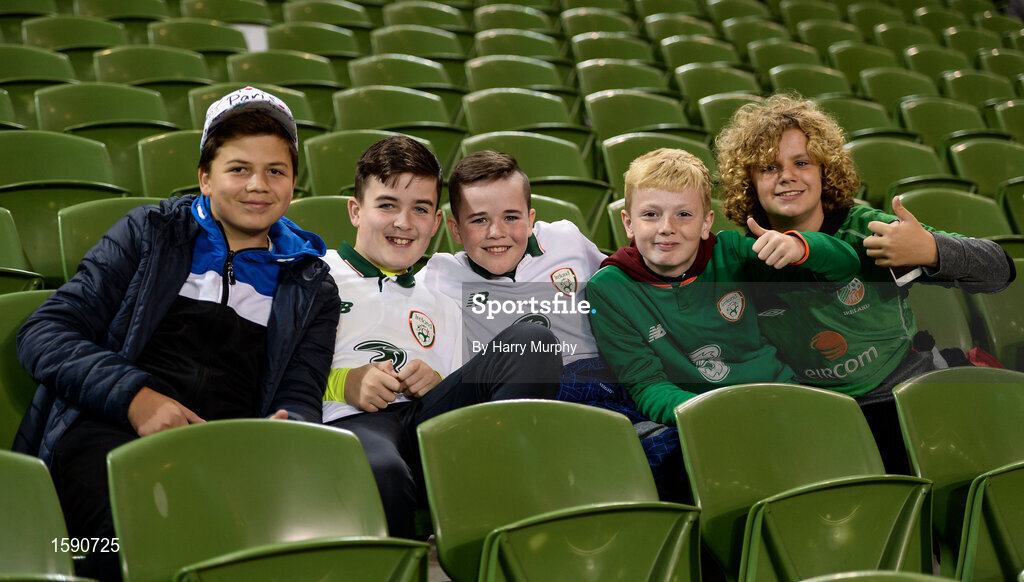 16 October 2018; Republic of Ireland supporters, from left, Mike Pricop, Adam Marshall, Adam Maguire, Sean Derwin and Thomas Lenny, all aged 12 and from Swords, County Dublin, prior to the UEFA Nations League B group four match between Republic of Ireland and Wales at the Aviva Stadium in Dublin. Photo by Harry Murphy/Sportsfile