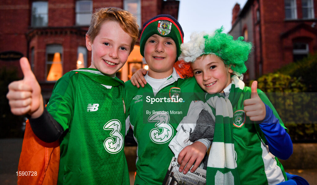 16 October 2018; Republic of Ireland supporters, from left, Lennon Conroy, Jack Carroll and Shay Conroy, from Clonaslee, Co. Laois, prior to the UEFA Nations League B group four match between Republic of Ireland and Wales at the Aviva Stadium in Dublin. Photo by Brendan Moran/Sportsfile