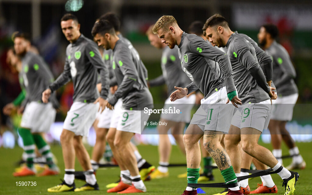 16 October 2018; James McClean, centre, of Republic of Ireland warms up prior to the UEFA Nations League B group four match between Republic of Ireland and Wales at the Aviva Stadium in Dublin. Photo by Seb Daly/Sportsfile