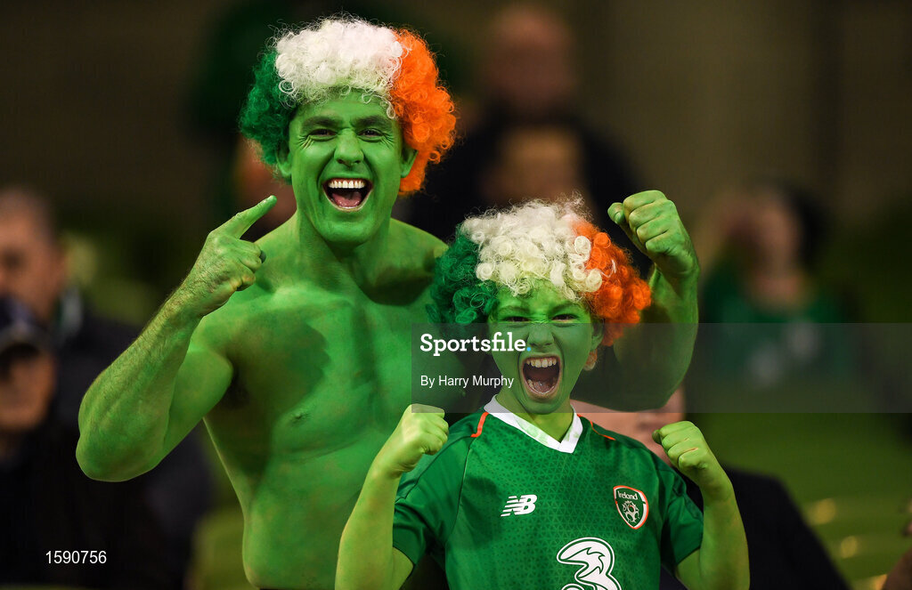 16 October 2018; Republic of Ireland supporters Clayton Peppard, age 12, with his dad Shane, from Clondalkin, Co Dublin, prior to the UEFA Nations League B group four match between Republic of Ireland and Wales at the Aviva Stadium in Dublin. Photo by Harry Murphy/Sportsfile