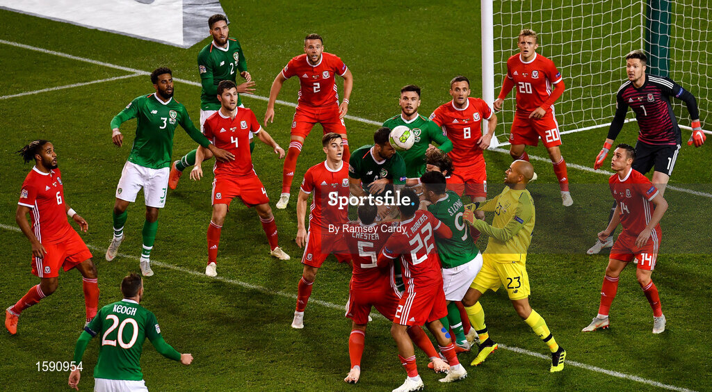 16 October 2018; Players from both teams battle for possession from a corner kick in the final minute of the UEFA Nations League B group four match between Republic of Ireland and Wales at the Aviva Stadium in Dublin. Photo by Ramsey Cardy/Sportsfile
