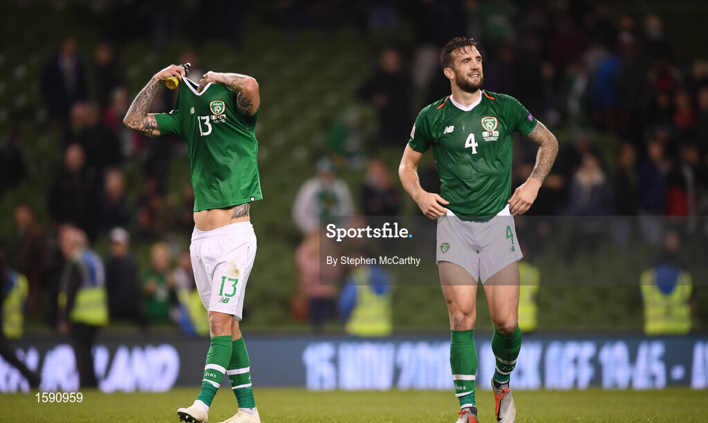 16 October 2018; Shane Duffy, right, and Jeff Hendrick of Republic of Ireland react following their side's defeat during the UEFA Nations League B group four match between Republic of Ireland and Wales at the Aviva Stadium in Dublin. Photo by Stephen McCarthy/Sportsfile