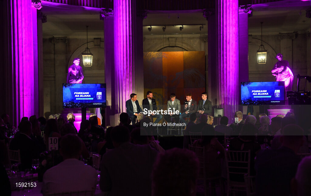 19 October 2018; Micheál Ó Domhnaill, Team of the Year Judge and Presenter, with from left, Ken McGrath, Team of the Year Judge, Fintan Burke of Galway, Robert Byrne of Tipperary, and Billy Hennessy of Cork at the Bord Gáis Energy GAA Hurling U-21 Team of the Year Awards at City Hall in Dublin. Photo by Piaras Ó Mídheach/Sportsfile
