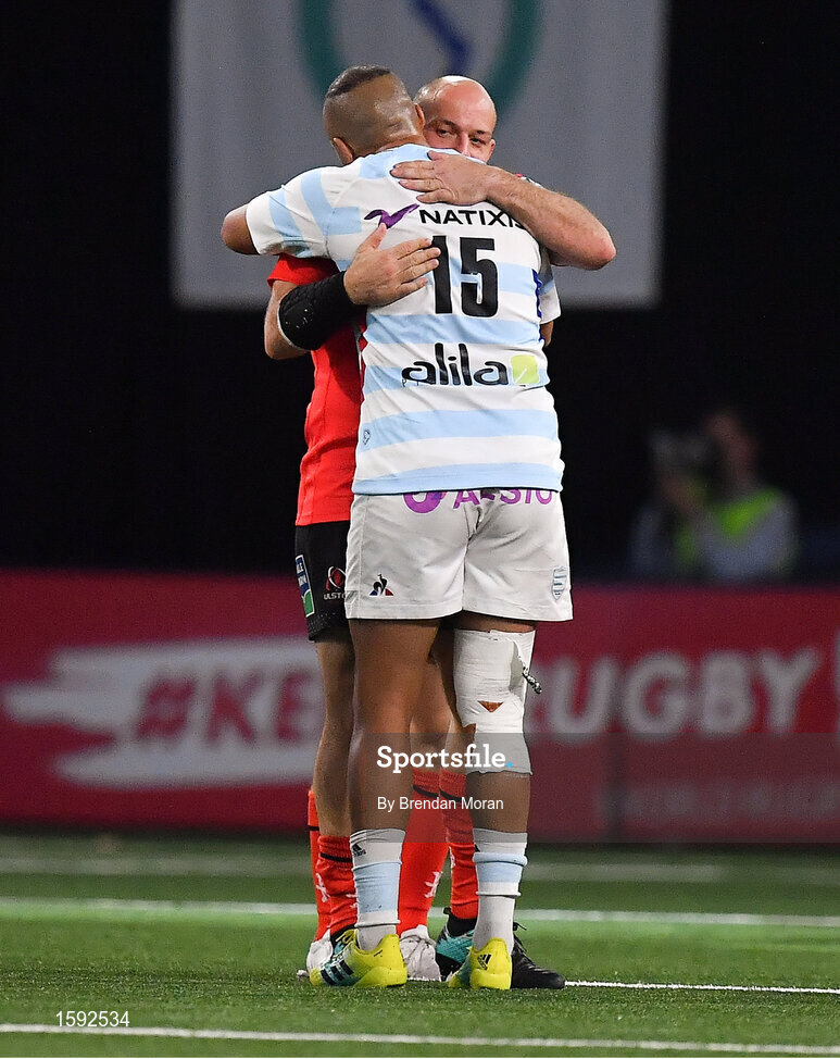 20 October 2018; Simon Zebo of Racing 92 and Rory Best of Ulster embrace after the Heineken Champions Cup Pool 4 Round 2 match between Racing 92 and Ulster at Paris La Defence Arena, in Paris, France. Photo by Brendan Moran/Sportsfile