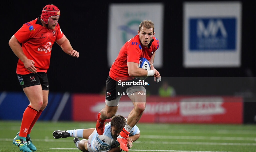 20 October 2018; Will Addison of Ulster breaks from the tackle of Leonard Paris of Racing 92 during the Heineken Champions Cup Pool 4 Round 2 match between Racing 92 and Ulster at Paris La Defence Arena, in Paris, France. Photo by Brendan Moran/Sportsfile