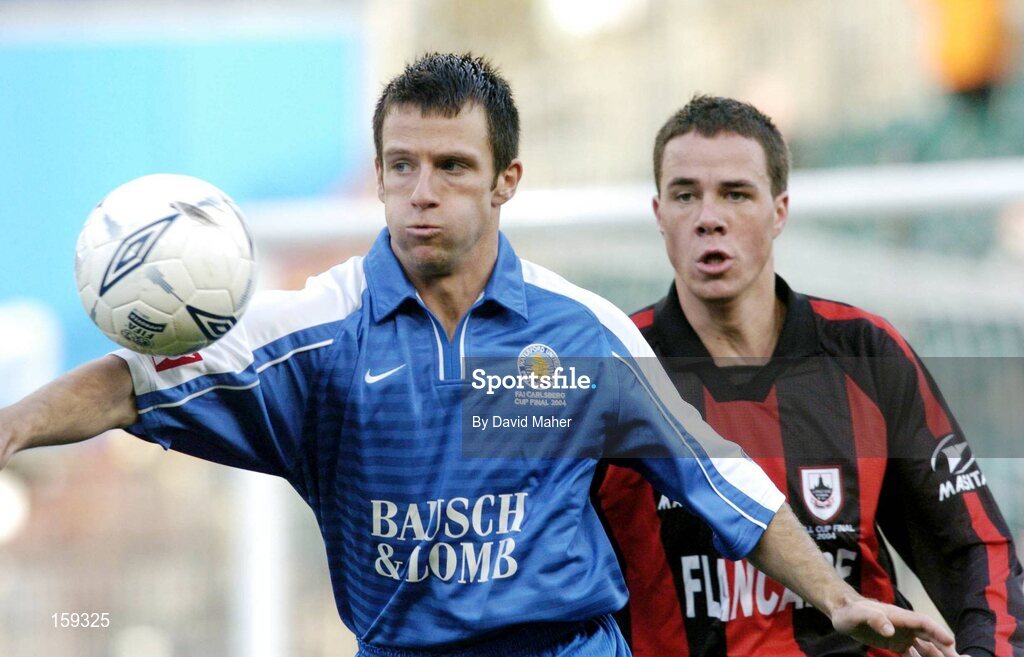 24 October 2004; Willie Bruton, Waterford United, in action against Graham Gartland, Longford Town. 2004 FAI Carlsberg Cup Final, Longford Town v Waterford United, Lansdowne Road, Dublin. Picture credit; David Maher / SPORTSFILE
