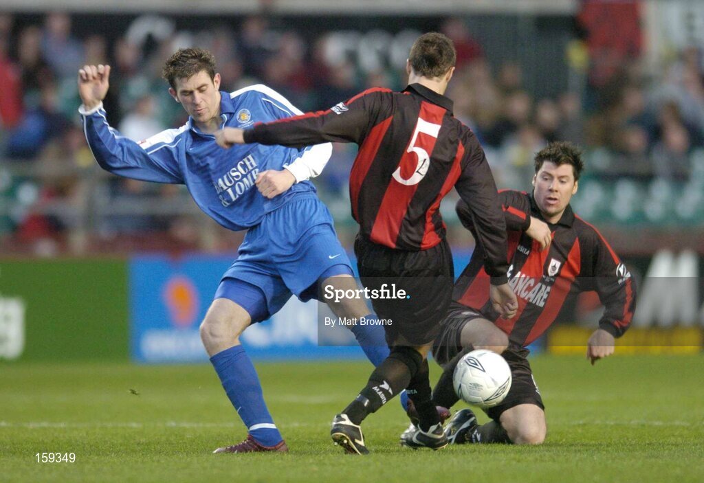 24 October 2004; Daryl Murphy, Waterford United, in action against Sean Dillon, 5, and Dean Fitzgerald, Longford Town. 2004 FAI Carlsberg Cup Final, Longford Town v Waterford United, Lansdowne Road, Dublin. Picture credit; Matt Browne / SPORTSFILE