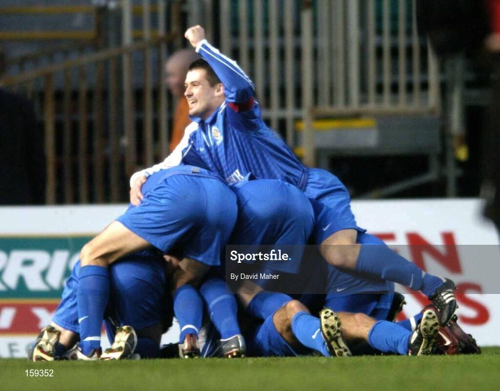 24 October 2004; John Frost, centre, Waterford United, celebrates after team-mate Willie Bruton had scored his sides first goal. 2004 FAI Carlsberg Cup Final, Longford Town v Waterford United, Lansdowne Road, Dublin. Picture credit; David Maher / SPORTSFILE