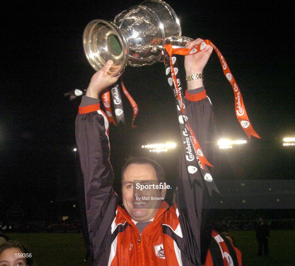 24 October 2004; Longford Town manager Alan Matthews with the FAI Cup after the win against Waterford United. 2004 FAI Carlsberg Cup Final, Longford Town v Waterford United, Lansdowne Road, Dublin. Picture credit; Matt Browne / SPORTSFILE