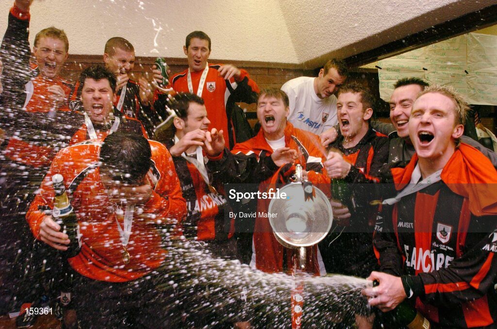 24 October 2004; Longford Town players celebrate in their dressing room after victory over Waterford United. 2004 FAI Carlsberg Cup Final, Longford Town v Waterford United, Lansdowne Road, Dublin. Picture credit; David Maher / SPORTSFILE